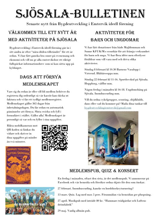 I årets första nyhetsbrev kan du läsa om kommande aktiviteter på Sjösala för både barn, unga och vuxna, vårens pubkvällar och evenemang, slöjd‑ och beredskapsträffar, årsmöte och fixardagar, sommarens loppis och auktion samt information om hur du följer oss i våra digitala kanaler. Klicka in för att ta del av allt som händer i bygden!